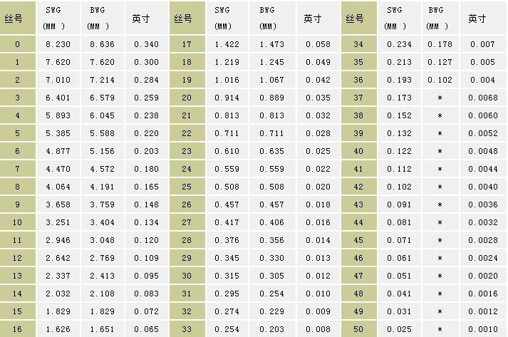有的客戶不明白護欄網(wǎng)絲徑絲號是什么。也不知道護欄網(wǎng)絲號對應的護欄網(wǎng)絲徑是多少。SWG英國線規(guī),BWG伯明翰線規(guī),AWG美國線規(guī)。一般我們說的絲徑是SWG,前面對應的是絲號。下圖給客戶們都包括了。這就是護欄網(wǎng)絲徑對照表。