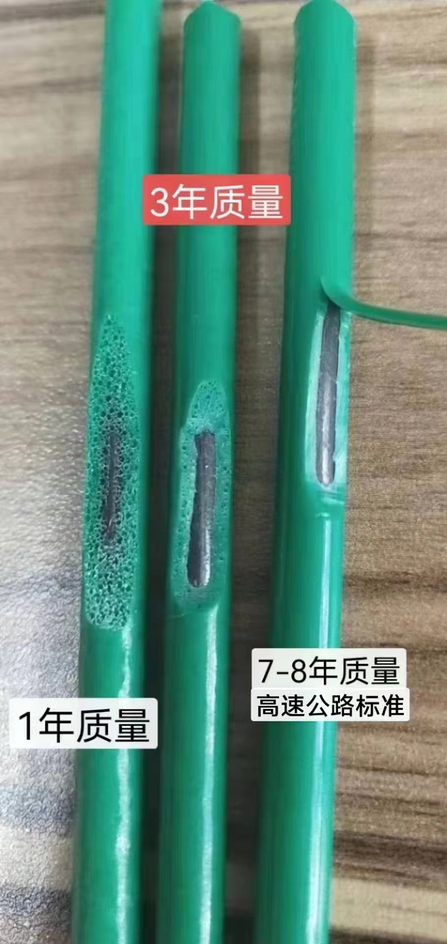 從這張圖片你會(huì)發(fā)現(xiàn)在護(hù)欄網(wǎng)外部絲徑相同的情況下,內(nèi)部絲徑有明顯的不同。浸塑護(hù)欄網(wǎng)的塑皮也有明顯不同。質(zhì)量好的護(hù)欄網(wǎng)內(nèi)部絲徑比較粗,浸塑表皮也是比較好的。這就是質(zhì)量好的浸塑護(hù)欄網(wǎng)浸塑表皮會(huì)在0.8-1.2mm。而質(zhì)量差一些的護(hù)欄網(wǎng),浸塑表皮是比較厚的超了那么范圍。這樣做的優(yōu)勢就是護(hù)欄網(wǎng)的內(nèi)部絲徑可以用細(xì)一些的絲徑??墒沁@樣會(huì)大大降低護(hù)欄網(wǎng)的使用壽命。