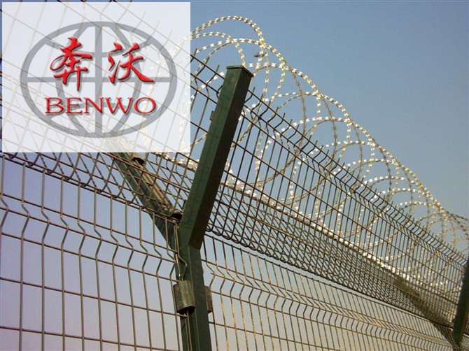 機場護欄網(wǎng)又稱作“Y型安全防御護網(wǎng)”,是由V型支架立柱,加強型焊接片網(wǎng),安全防盜連接件和熱鍍鋅刀片刺籠組成加強度和安全防御性級別很高。